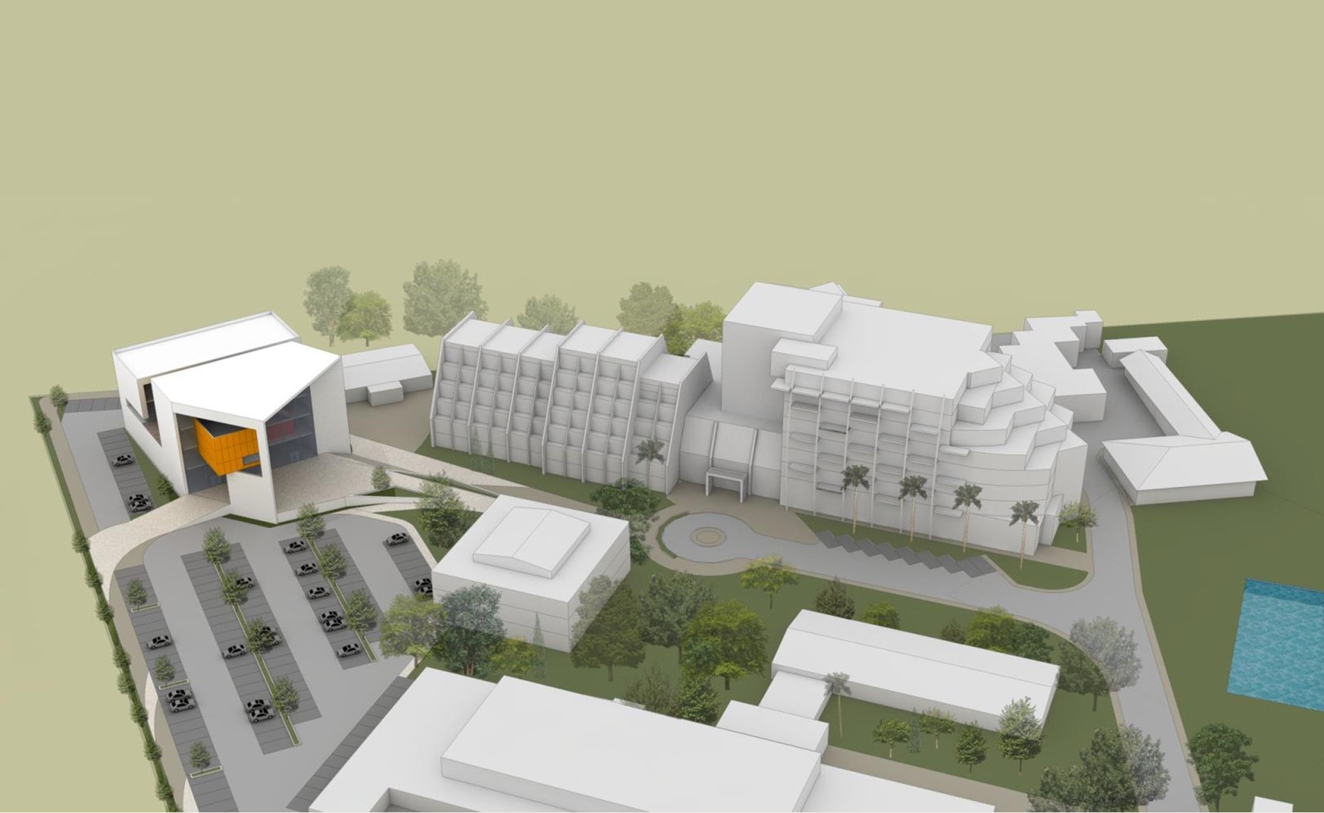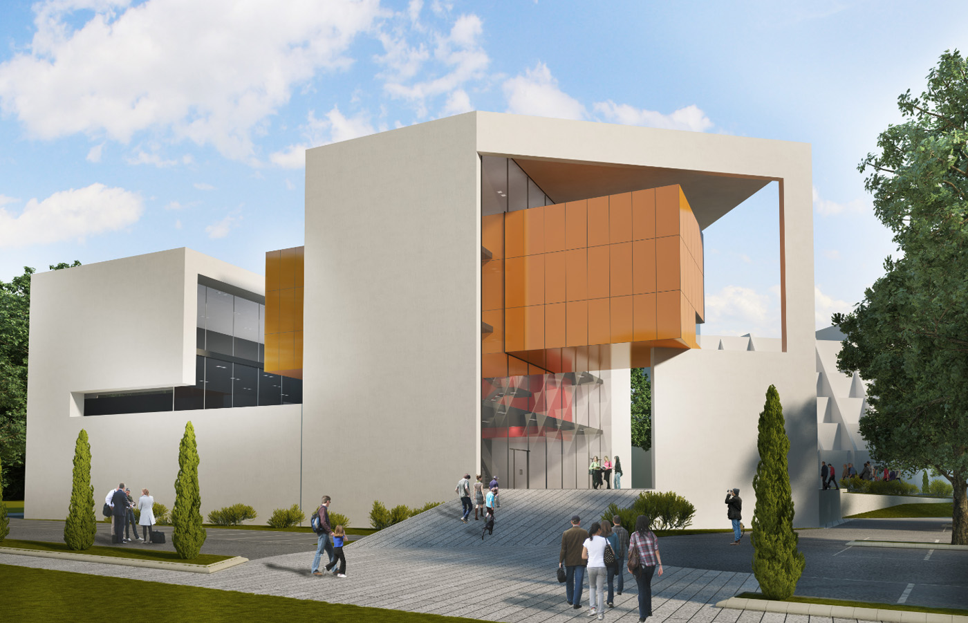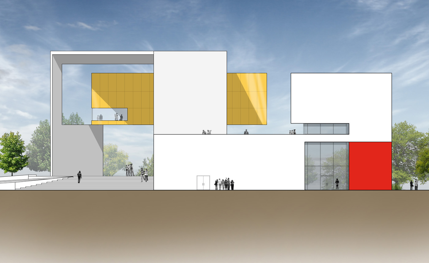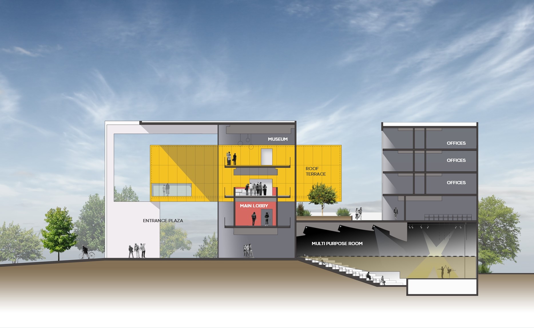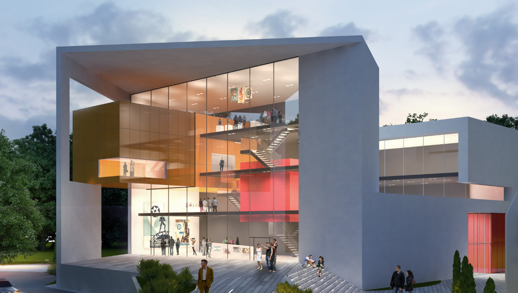 The DNA of this building exudes dynamism, precision, delicate balance, levitation, transparency, and an elusive quality of grace. Our proposed structure embodies these qualities, taking the form of a white cube that appears inviting, happy, and unencumbered. This cube has been designed to accommodate museum spaces, an office wing, classrooms, and a hostel, all while allowing for clear separation between these areas. To maintain consistency with the existing buildings on the Kfar Maccabiah campus, we have used a combination of white plaster, glass, and colored aluminum boxes for the building's finishing materials and architectural language. To create a bright, impressive showcase for daily life in the Maccabiah village, we have transformed the museum from a flat box on the second floor into a transparent vertical structure connected to the entrance hall. The museum and the other areas are housed within the white cube, which is located at the end of the boulevard axis and elevated on a plinth. A ramp leads up to the entrance, creating a special and memorable experience for ceremonies and events. The ramp connects to a covered entrance plaza and foyer, which in turn lead to the museum and other areas inside the building, creating a seamless sequence that can elevate many activities within the Maccabiah village.