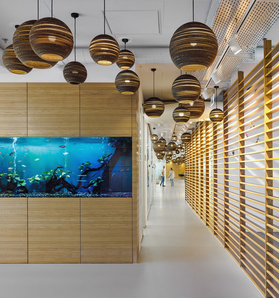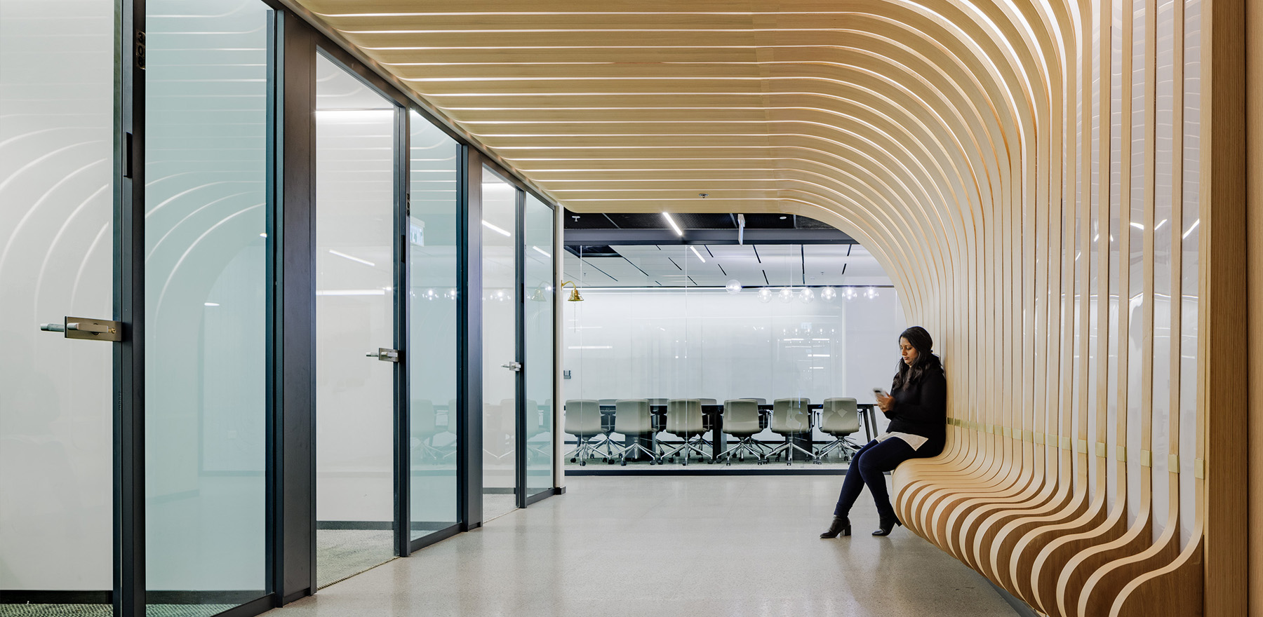 The muted colors, subtle materiality, and clean lines, flowing continuously on a unique grid, create an inviting, pleasant, and youthful space suitable for both the company's employees and its clients