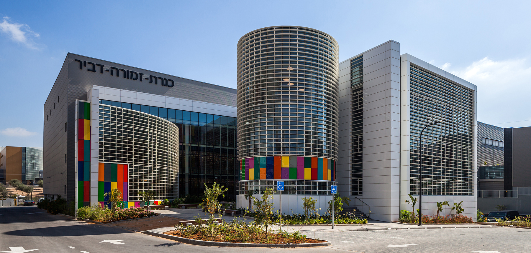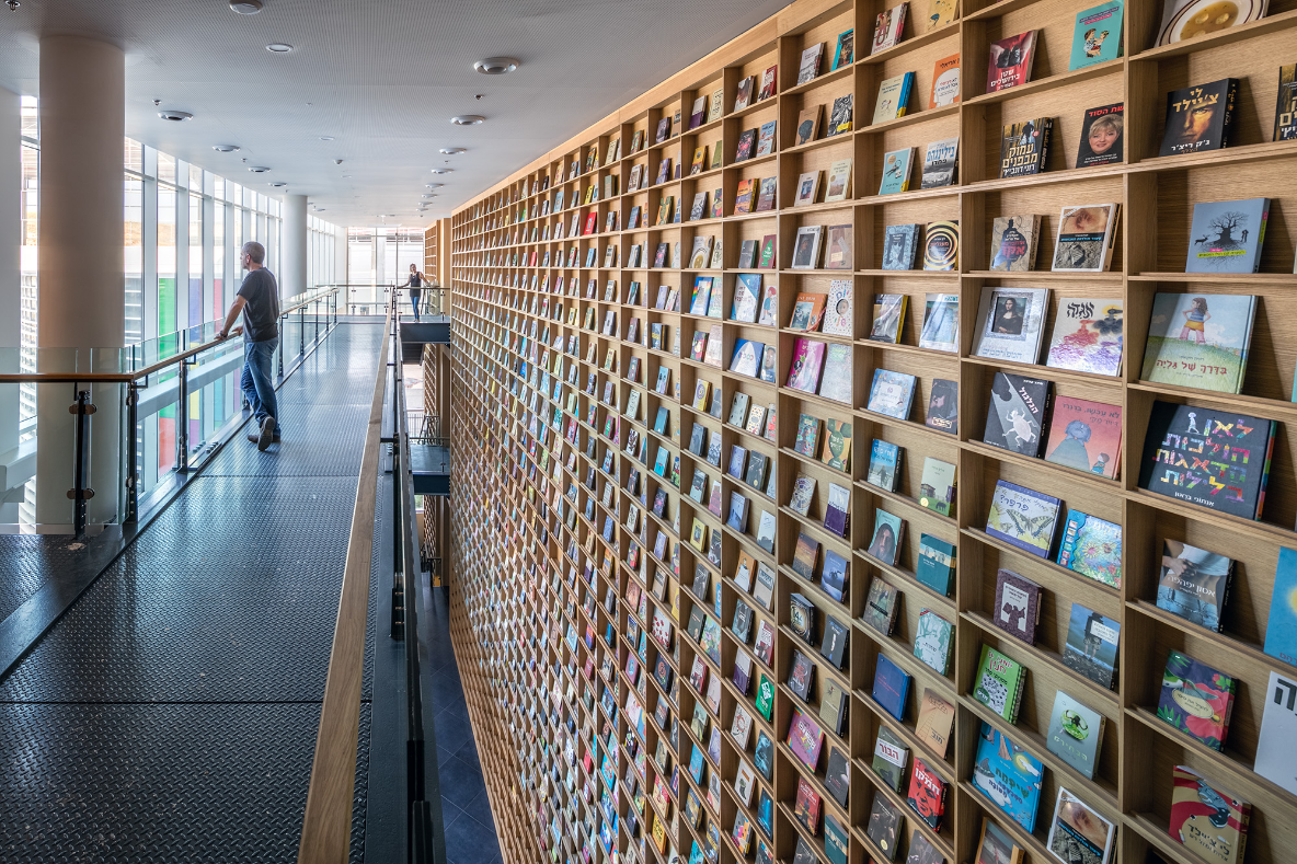 האסתטיקה של אלפי כריכות ססגוניות תורגמה למוטיב של אריחי זכוכית צבעוניים המעטרים את חזיתות המבנה. את ההתפרעות הצבעונית מרסנת גאומטריה לבנה וקשיחה. בין המבנים משתרעת החצר הפנימית ומכל אגף, בכל שעה משעות היום, ניבט מראה מרתק ומפתיע.