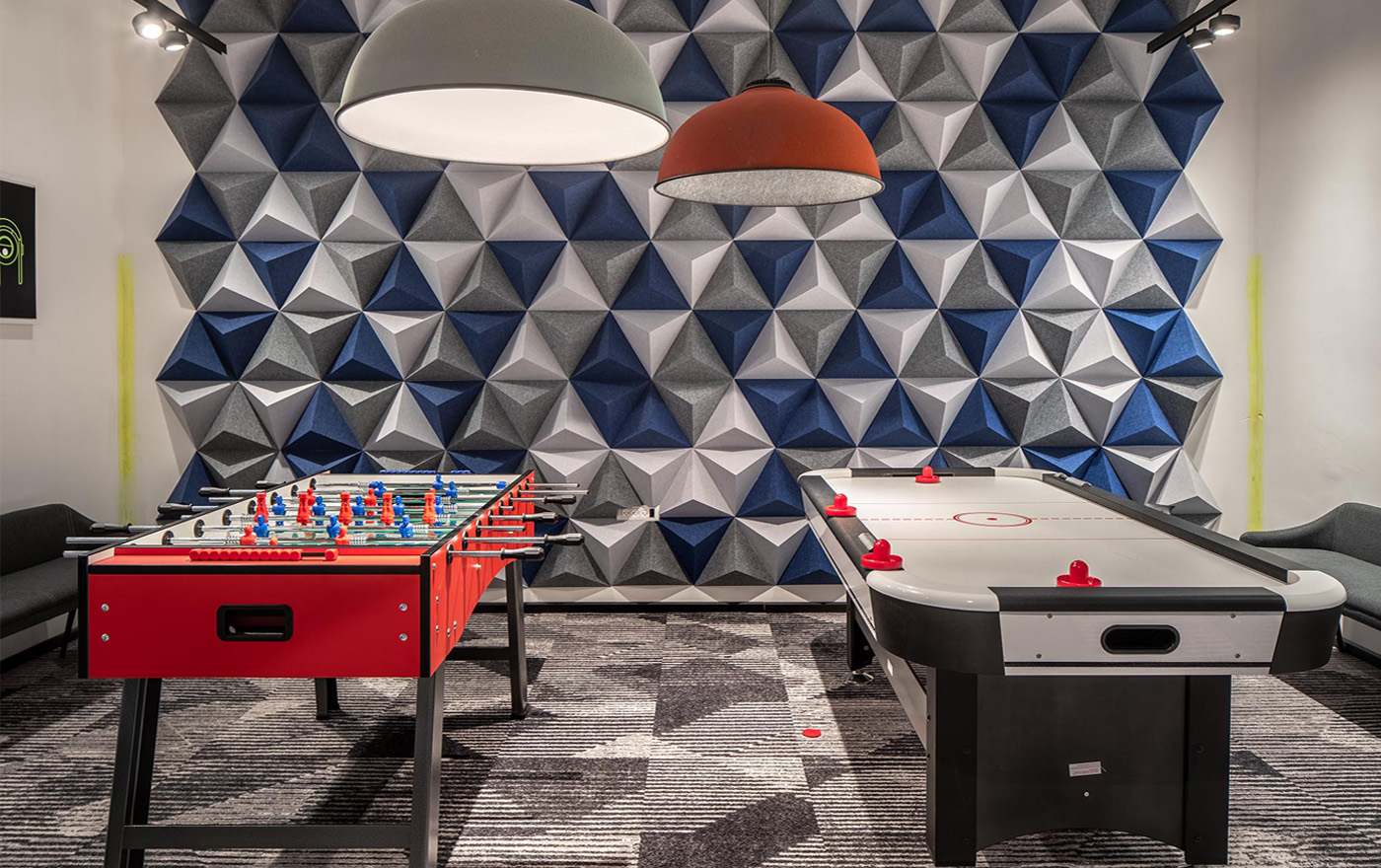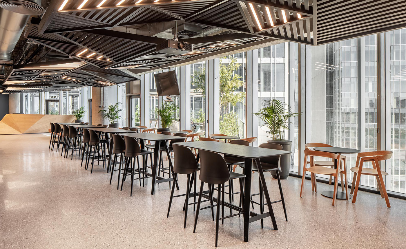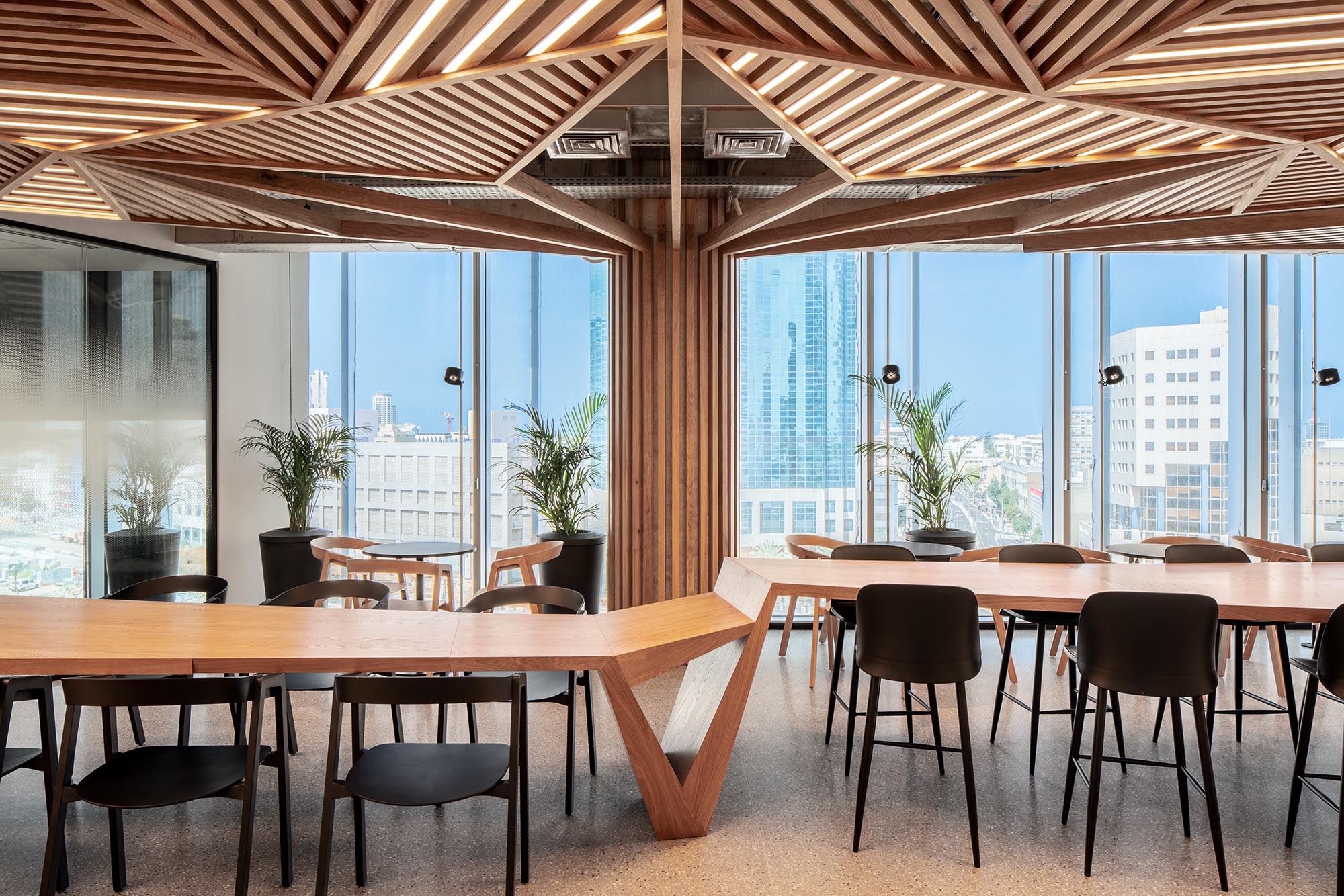 תקרת העץ הגיאומטרית היא מוקד עיצובי בולט, המוסיף חמימות ועניין ויזואלי לחלל. תאורת LED משולבת בתקרה מספקת תאורה רכה ואחידה. אזור הישיבה כולל שולחן עץ גדול עם כיסאות בר, המעודד שיתוף פעולה ודיונים לא פורמליים. המטבח המודרני מאובזר היטב, עם ארונות לבנים נקיים וקיר אריחים גיאומטרי מעניין. החלל פתוח ומחובר לאזורי העבודה, מה שמאפשר לעובדים גישה נוחה למזון ומשקאות.