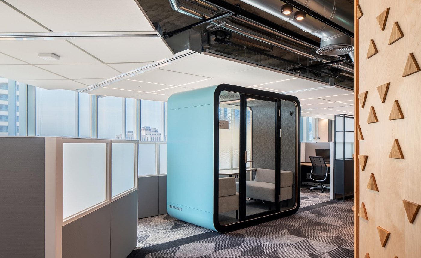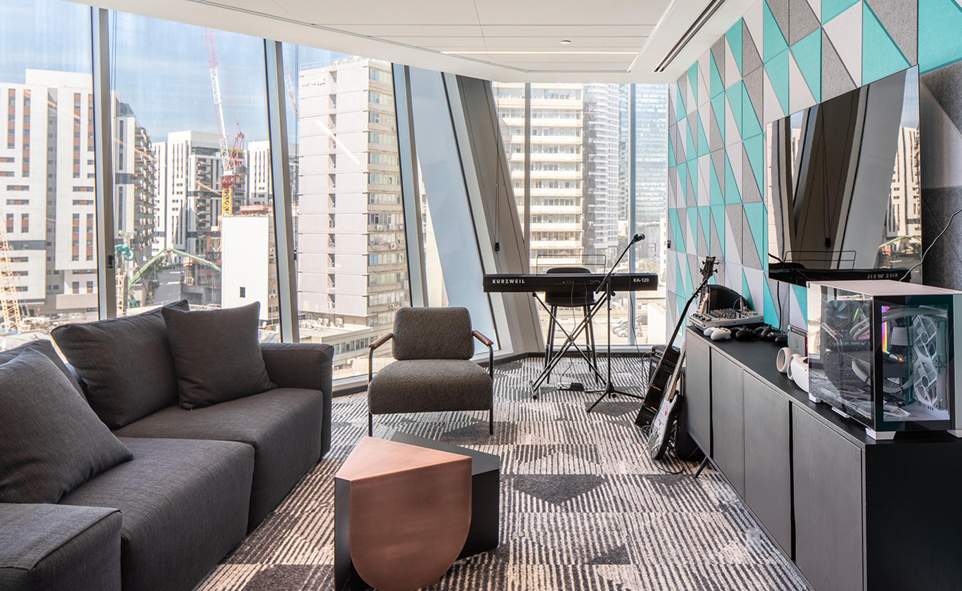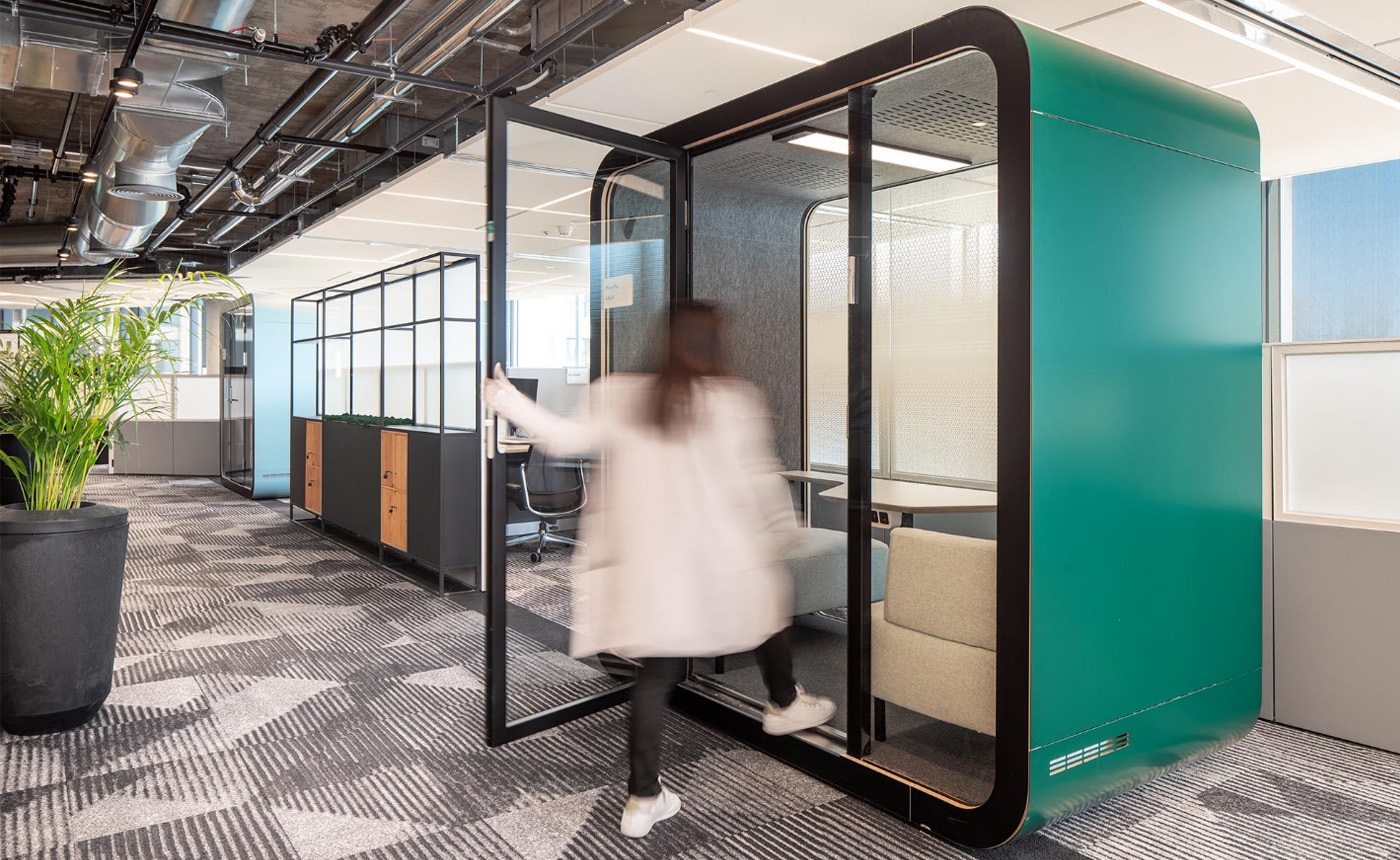 קיר הזכוכית הגדול מכניס אור טבעי ומספק תצוגה של אזור העבודה הסמוך, תוך שמירה על הפרדה אקוסטית. הרצפה בגימור טרצו מלוטש מוסיפה מראה תעשייתי מעודן. בחללי העבודה יש שטיח לשמירת השקט ואקוסטיקה נעימה בחלל