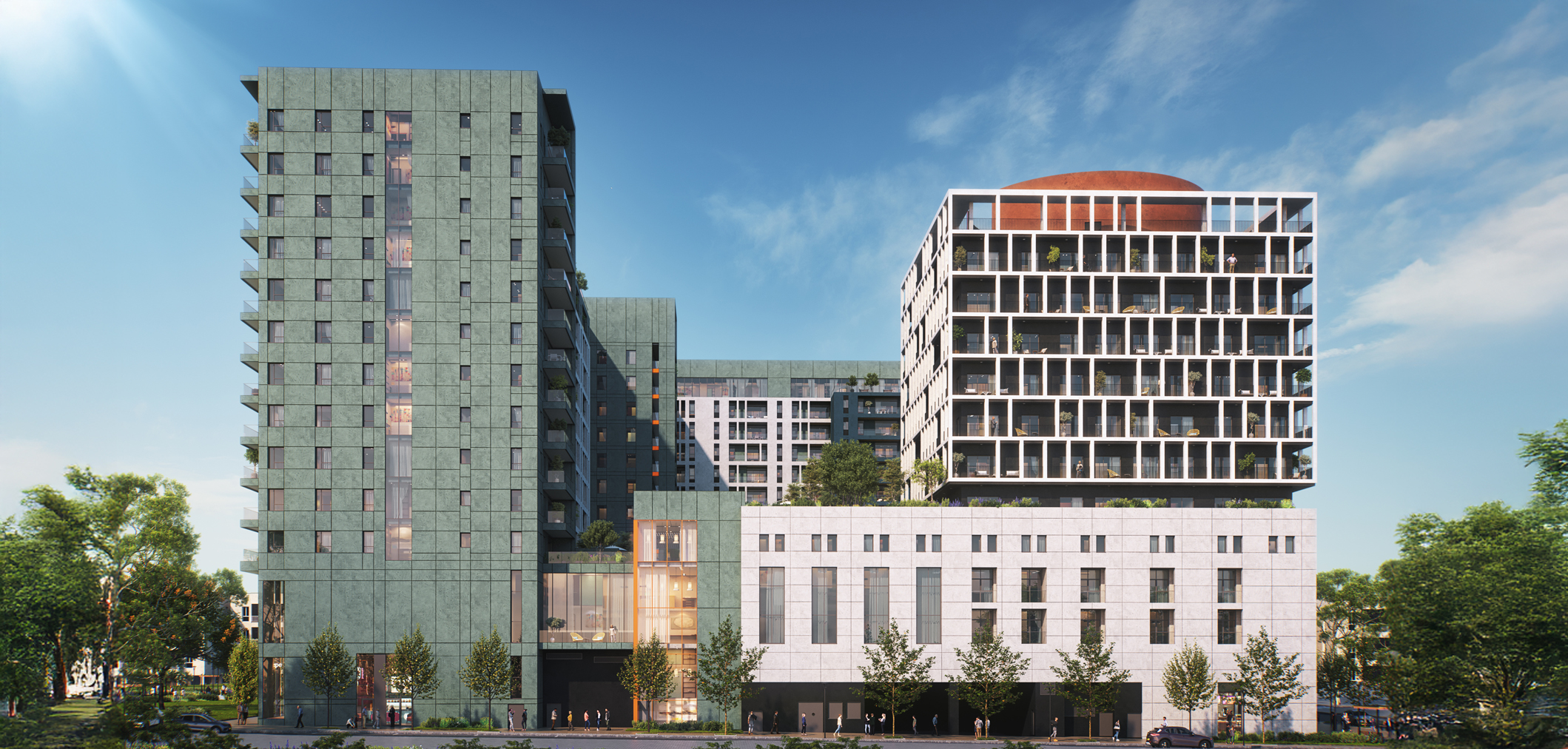 הפתרון היה לפרק את המסה הגדולה למקצבים אדריכליים קטנים ועדינים יותר – סדרה של מאסות ורטיקליות מגוונות, היוצרות מקצב מבנים בקנה מידה שכונתי. כך נוצר איזון בין עוצמה לרגישות, בין פרויקט עירוני בקנה מידה גדול לבין מרקם שכונתי בגובה העין.