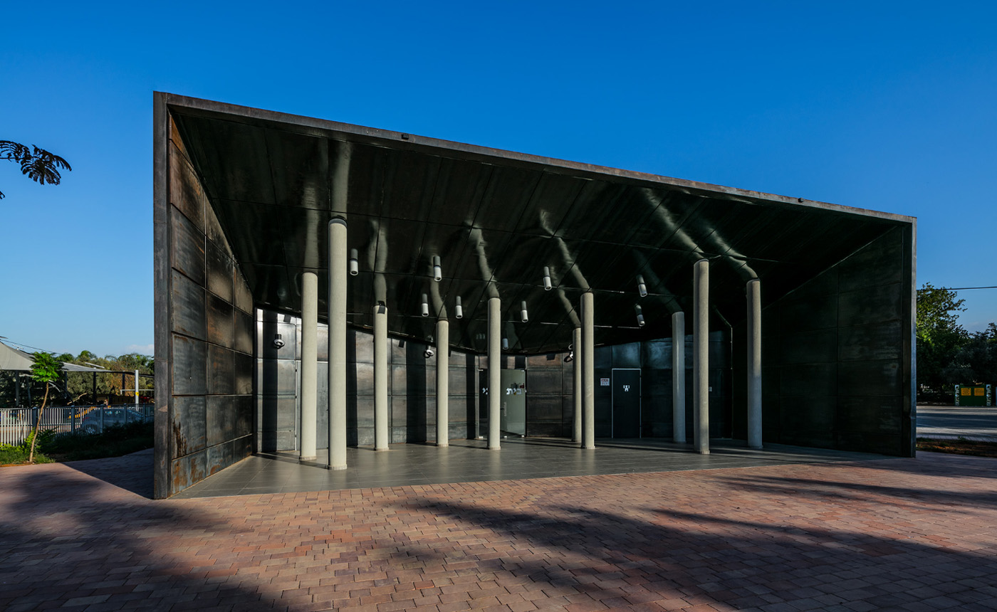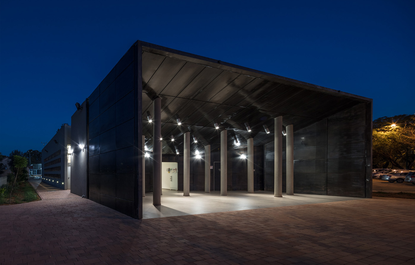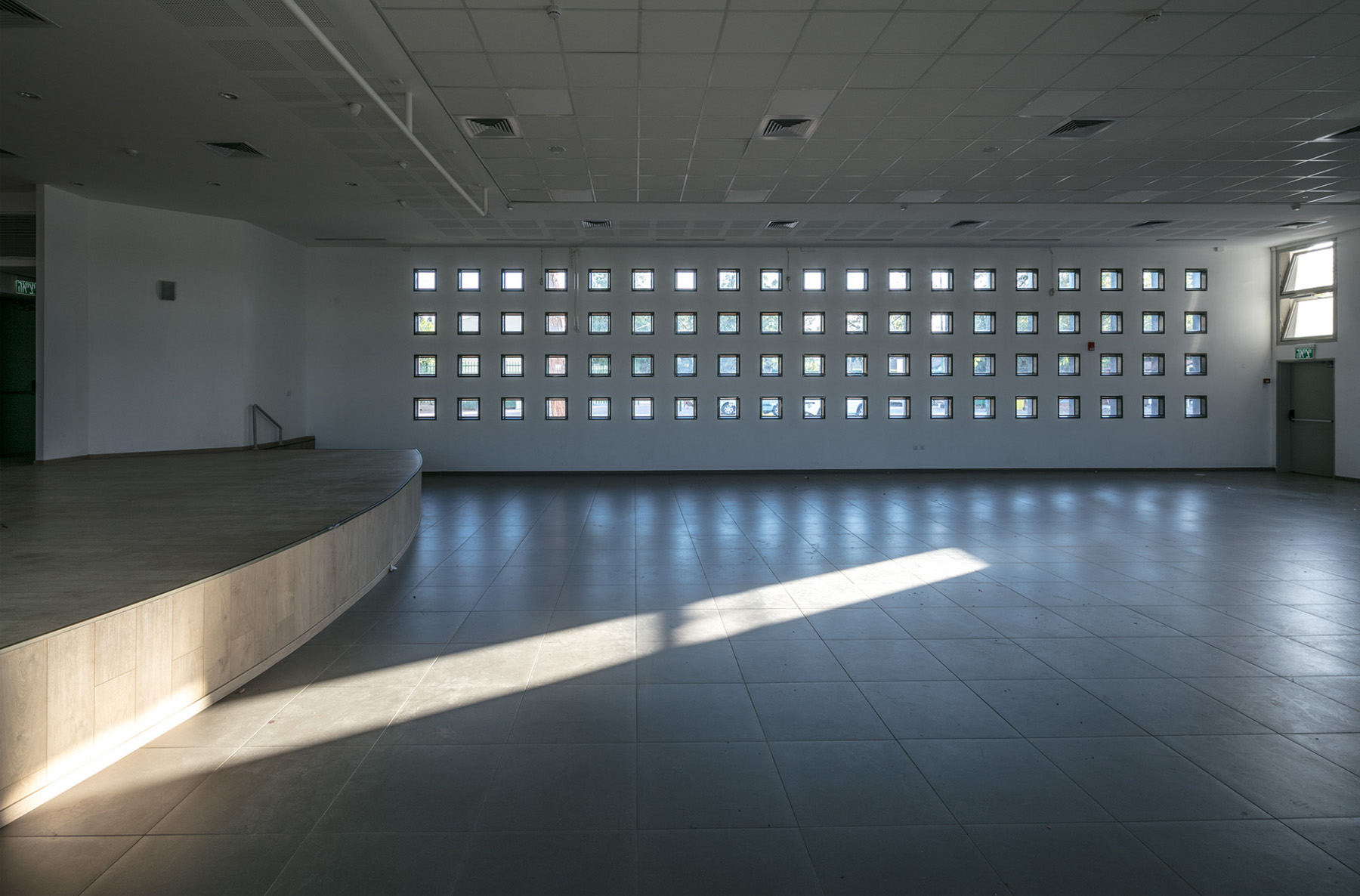 התקציב המצומצם לא פגם ביכולת לייצר חזיתות מרתקות. רשת של חלונות מרובעים, המצופים בברזל פשוט מעטרת את החזיתות הצדדיות המאורכות של המבנה. הפתחים מייצרים קשר עין בין פנים וחוץ, ועם רדת החשיכה יוצרים רשת של אורות המושכים את העין אל המבנה. האולם המיועד לכ-300 מושבים, נותר ללא ריהוט קבוע, במטרה לשמור על גמישות לפעילויות השונות.
