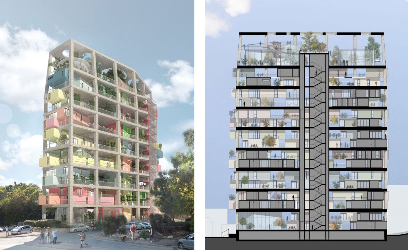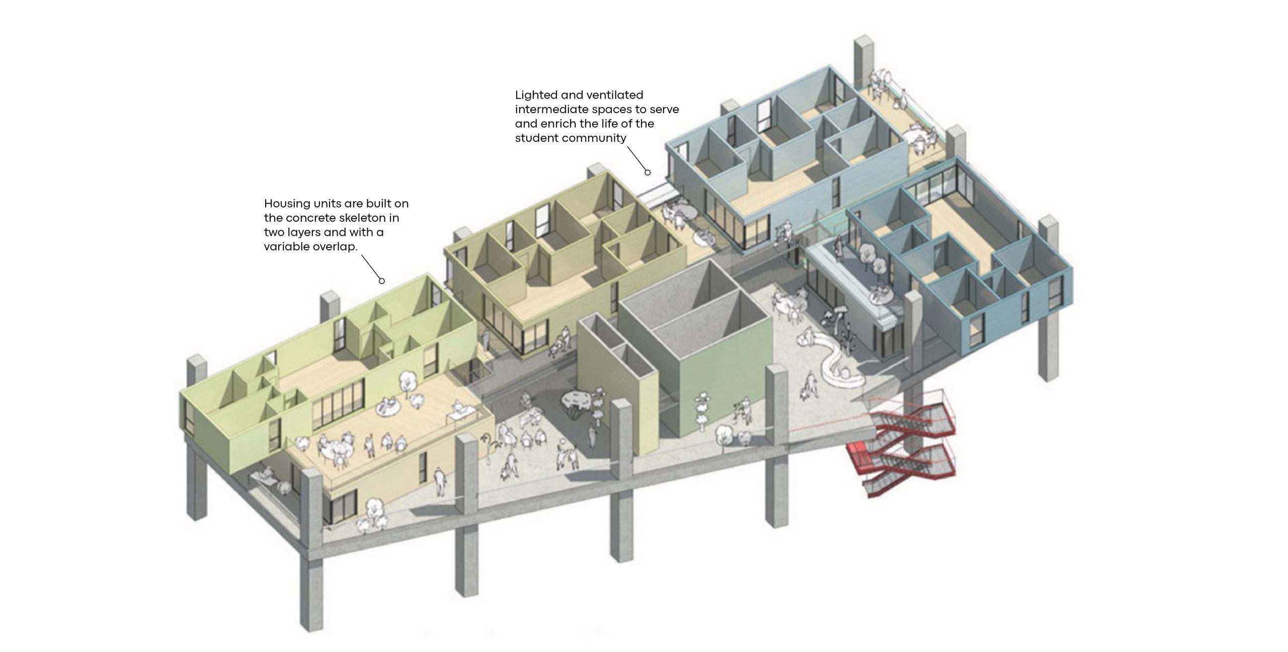 ההצעה מציגה אלטרנטיבה לתפיסת המגורים הטיפוסית ומציעה מודל לחיי קהילה במבנה ורטיקלי אשר מקבץ את יחידות הדיור סביב מרחב ציבורי משותף שמתאים לאורח החיים הסטודנטיאלי.
