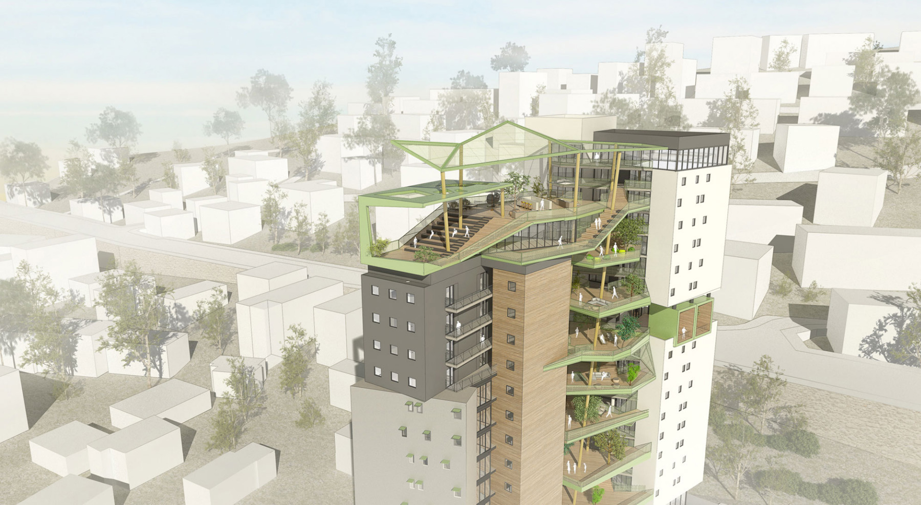 צורת המפלסים הירוקים משתנה מקומה לקומה ומיקום המפלסים הציבוריים בגובה מחצית קומת מגורים, מבחין ומדגיש את ההפרדה בין האזור הפרטי לאזור הציבורי. אותם מפלסים הנעים בחופשיות ובקלילות במרכז הבניין מאפשרים כניסה מקסימלית של אור טבעי ואוויר לחזיתות הפנימיות.